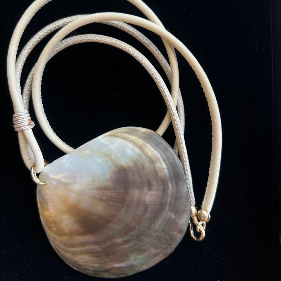 שרשרת צדפה מאם הפנינה טבעית (mother of pearl) בשילוב רצועת עור בגוון שמנת